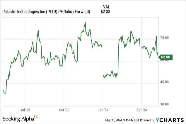 The same conclusion can be drawn when looking at Palantir's forward P/S ratio - the company appears overvalued by this metric as well. However, these ratios often do not capture the potential growth of rapidly growing tech companies, which is important to consider when assessing Palantir's value.