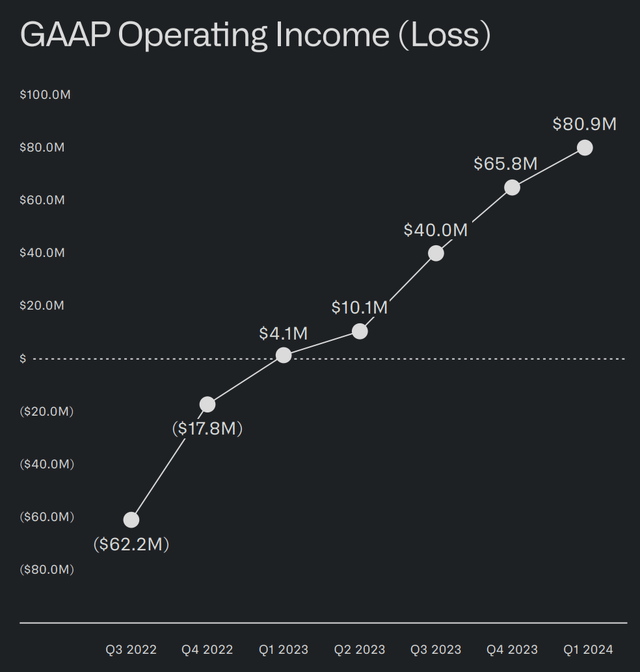 Let's focus on some of the standout figures Palantir revealed during their Q1 earnings presentation. One particular number jumps out: operating income. Since Q2 2023, Palantir's operating income has been climbing steadily, reaching just under $81M in Q1 2024. It is key for Palantir to continue increasing its operating income as it continues to grow at a steady pace.