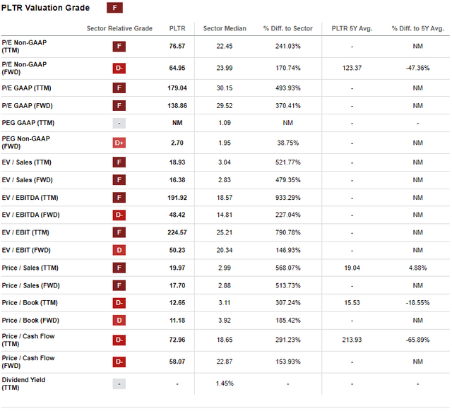 We understand the thinking behind the overvaluation argument, and when looking at Seeking Alpha's valuation grades, Palantir definitely stands out for its poor valuation grade. Focusing on the P/E ratios, both non-GAAP and GAAP for TTM and FWD figures are significantly worse than the sector median, receiving 'F' grades. Specifically, Palantir's P/E GAAP (TTM) stands at 179.04 and P/E Non-GAAP (TTM) at 76.57, both much higher than the sector medians of 30.15 and 22.45, respectively. While this could be due to anticipated higher growth or unique competitive advantages, the current market sentiment seems skeptical of these premiums.