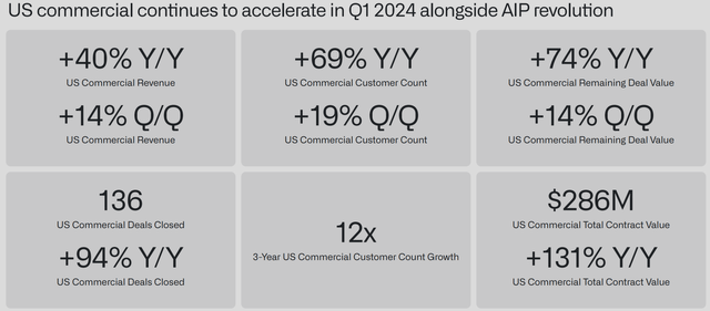 These numbers highlight significant and consistent enhancements across revenue, customer counts, and deal values. Palantir's distinct AIP product sets them apart in the market, a point that CEO Alex Karp has made: "I don't believe we have competitors. So, I don't believe we have competition in the U.S. commercial market. I don't believe in the U.S. government market, we have competition." This confidence underscores the unique position of Palantir and hints at a clear path ahead for continued, if not accelerated, growth. Given these dynamics, it's plausible to expect the strong growth figures we're seeing now to persist and expand well beyond 2024.