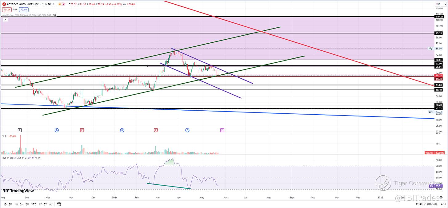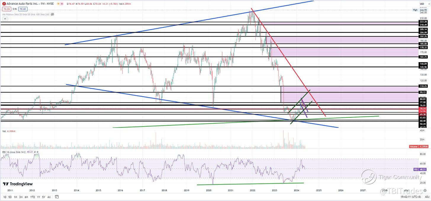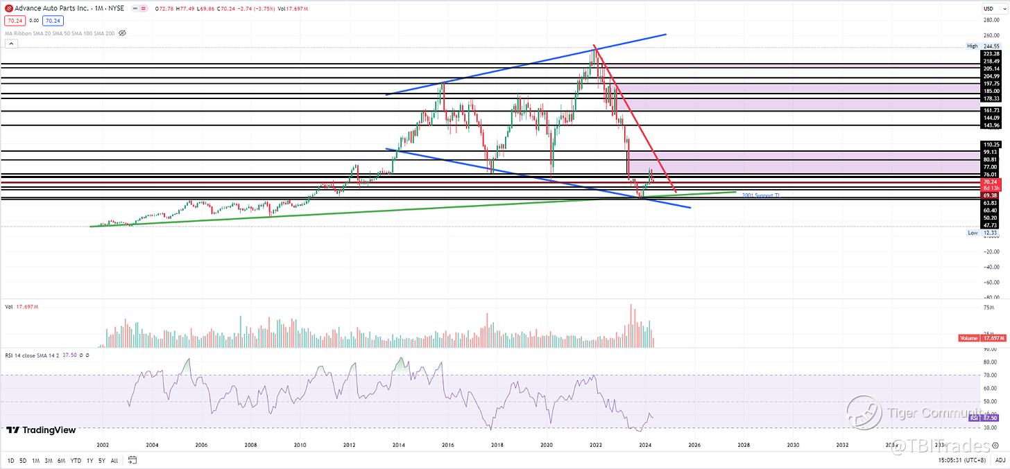 AAP’s chart is extremely interesting. It has been forming a series of higher highs and higher lows. Recently, it retested and successfully defended its 23-year old support trendline. The main pattern on AAP is that of a bullish megaphone pattern, with a series of higher highs but lower lows. It has a multitude of gaps to the upside, being one of the worst performers in 2022 and 2023. It is imperative for AAP to defend its bullish megaphone support trendline (in blue) and the 23-year support trendline for further upside.