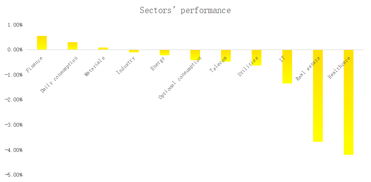 By sectors, healthcare, which is more sensitive to interest rates,fell sharply again. Only finance, daily consumption, and materials managed to stay afloat.