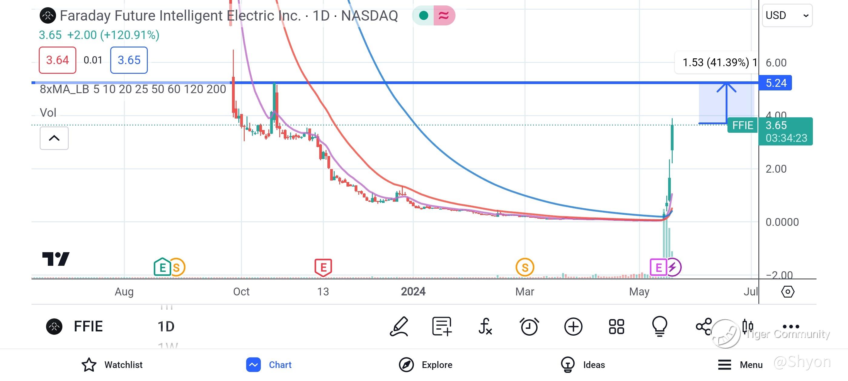 By looking at its technical chart, due to the craziness of the stock, nothing much we can analyze through technical indicators. However, we can apply "see profit, take profit' strategy. The stock is in a crazy stage now with overbought condition. The pullback will be anytime and will be very painful as well. The potential upside is around another 41% from current price, but the risk is super high. I guess FFIE will retrace, just like GME and AMC after some unreasonable rally. For such, I am $Faraday Future Intelligent Electric Inc.(FFIE)$