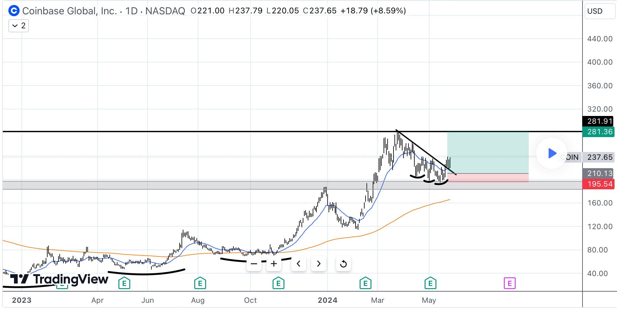 $Coinbase Global, Inc.(COIN)$ COINBASE has broken out of a bullish triangle pattern it as been printing for days. A successful break and rest of the previous resistance zone on the weekly time frame. I expect COIN to continue its strong uptrend over the next few weeks.
