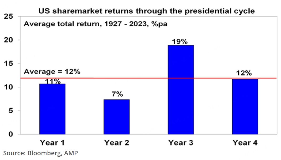 Since 1927, the election year, or year 4 in the presidential cycle, has had a return of around 12%.