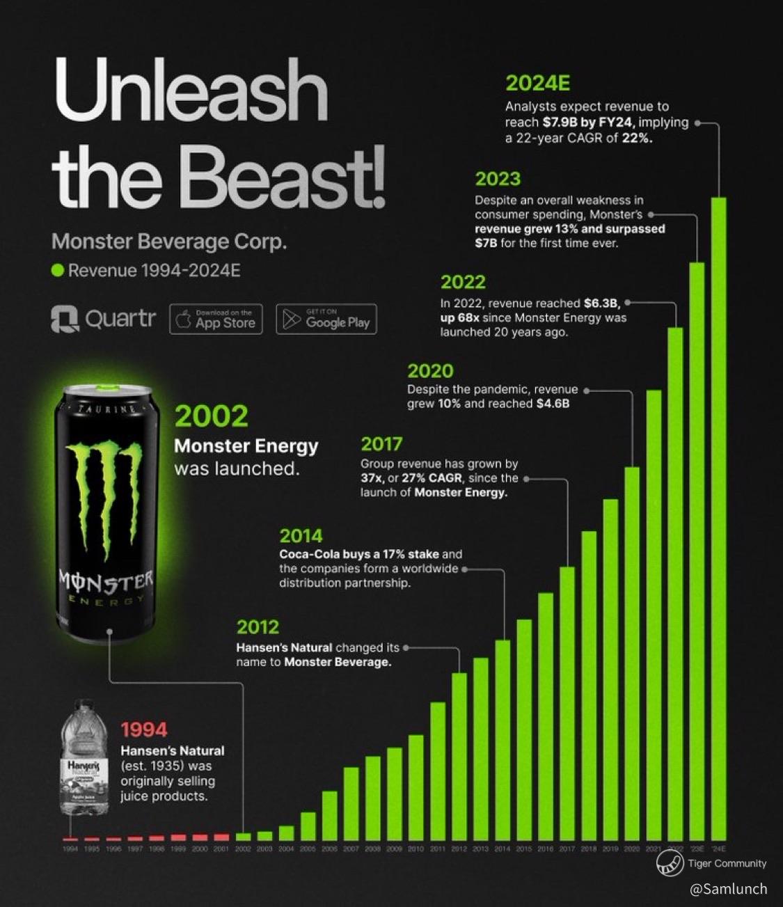 22 years after "unleashing the beast," $MNST is expected to reach almost $8 billion in revenue in 2024, implying an incredible 22% CAGR since inception.