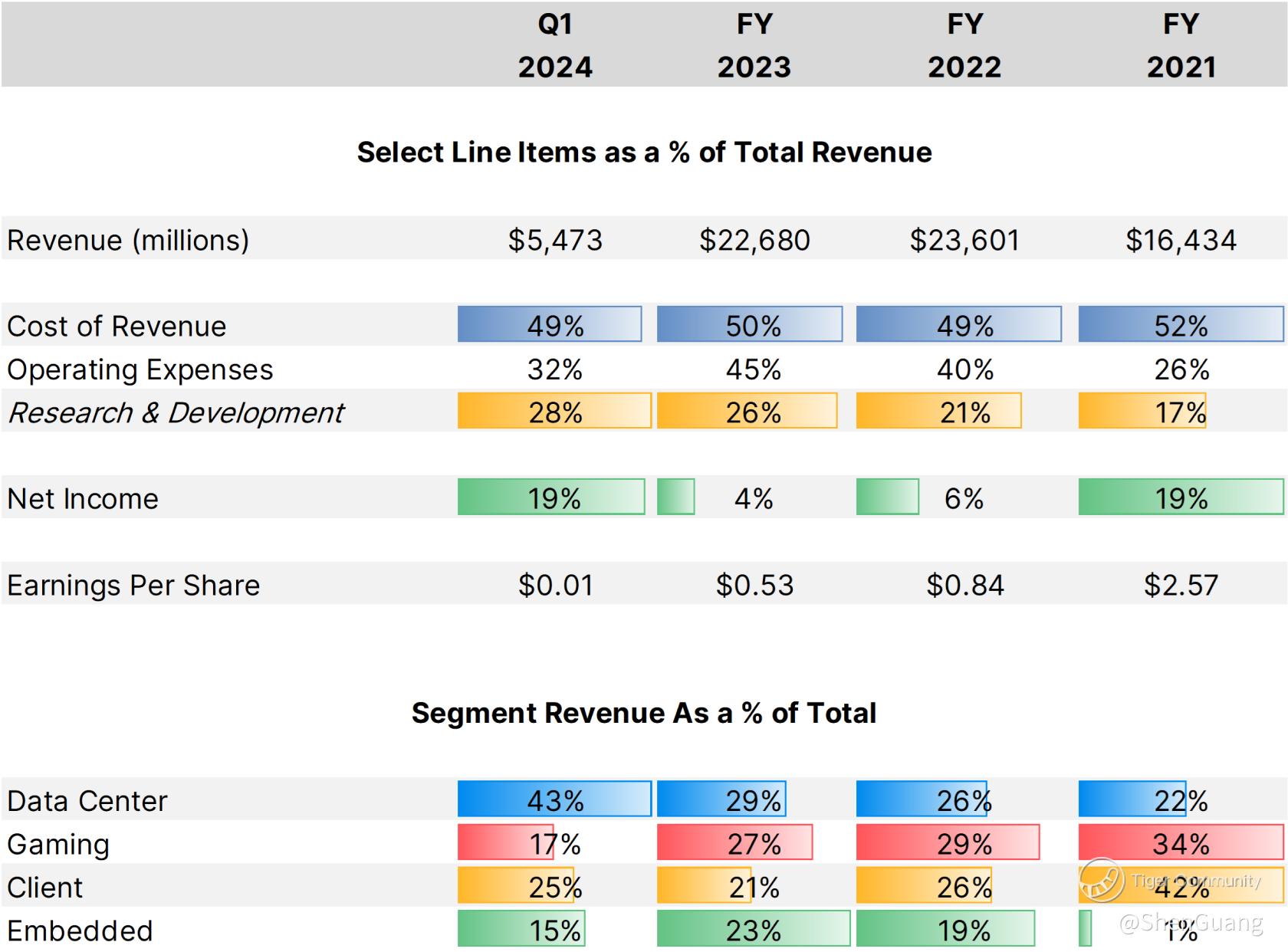 Just as with NVIDIA in 2022, roughly half of AMD’s Q1 2024 revenue is attributable to its Data Center segment. Unlike NVIDIA, only half as much revenue is attributable to Gaming. Also unlike NVIDIA is revenue contributions from Client and Embedded segments, which collectively make up 40% of AMD’s revenue unlike 9% in NVIDIA’s case in 2022. In the most recent quarter, NVIDIA’s contributions from these two segments have dwindled to 3%.
