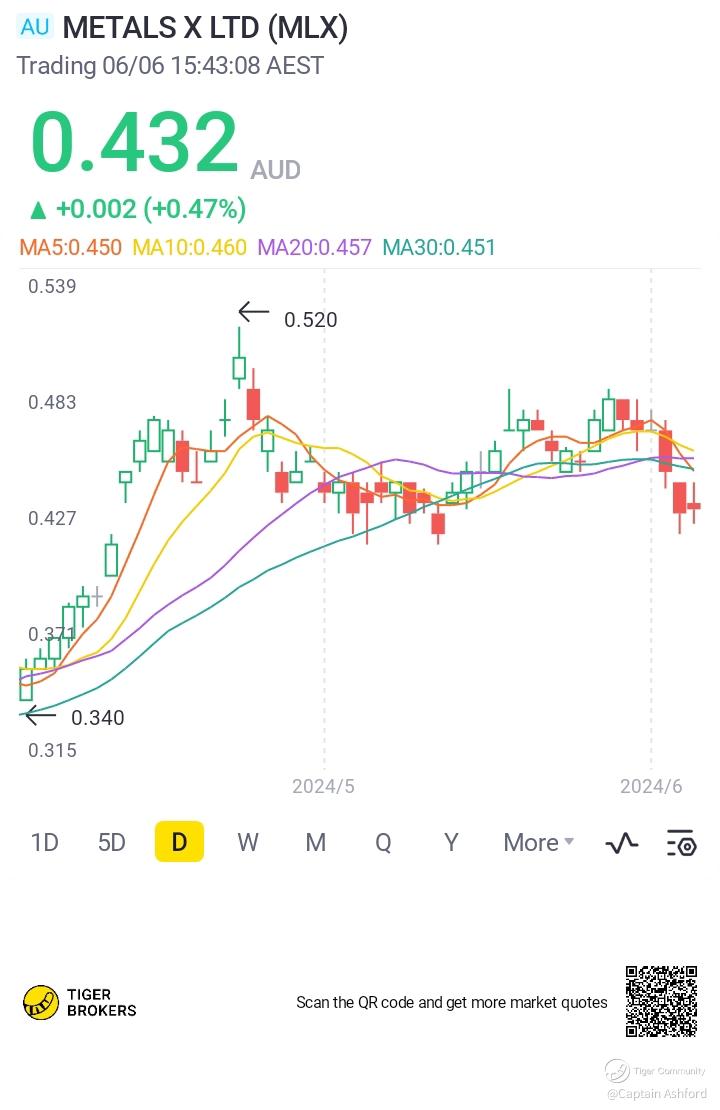 $METALS X LTD(MLX.AU)$ The recent pull back to technical support potentially offers a useful entry point into this ASX tin miner (very unusual). In my view, MLX offers a deep value play leveraged to the long term tin price (crucial for electronics). MLX has a large, growing cash balance which recently ear-marked for a new buyback programme. MLX also has indirect exposure to copper via its holding of Cyprium Metals convertible notes. So if you are commodities bull, it could be worth a look!