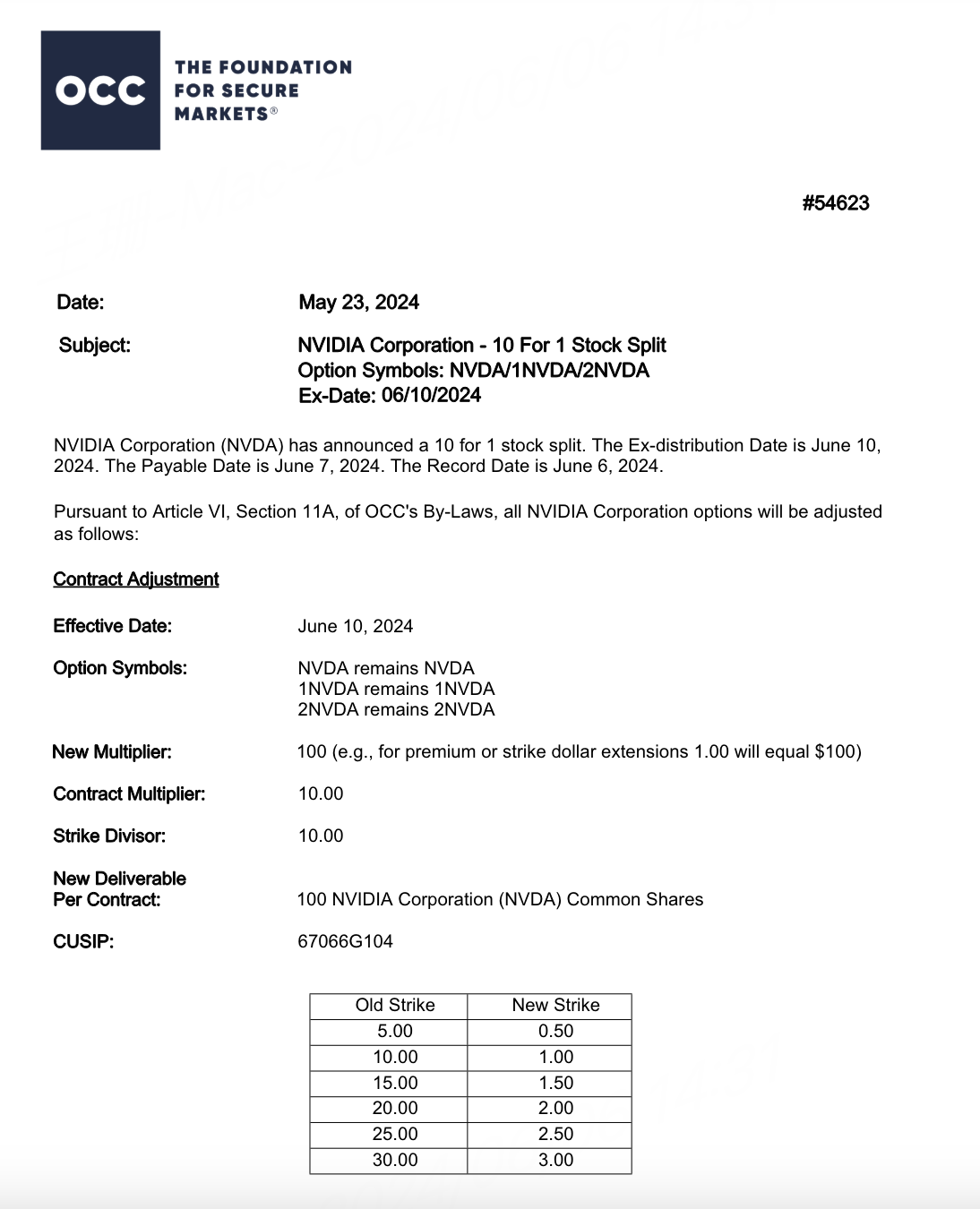 According to the Options Clearing Corporation (OCC), NVDA’s stock split will also proportionally split the options.