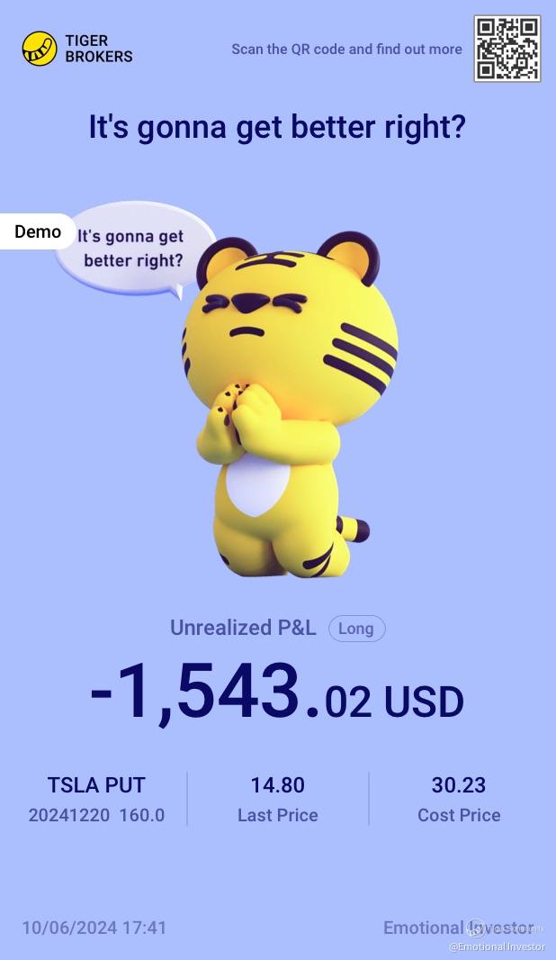 $TSLA 20241220 160.0 PUT$ So in my journey to understand options, I'm doing well on buying calls, betting on Winners. This is just a demo trade so please don't be alarmed, no real money lost. But I think I have learned a valuable lesson here.