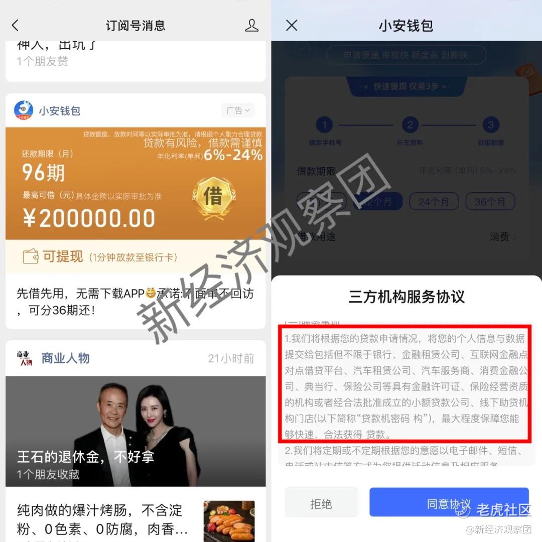 “小安錢包”相關服務協議顯示,公司將根據貸款申請情況,將用戶的個人信息與數據提交給包括但不限於銀行、金融租賃公司、互聯網金融點對點平臺、汽車租賃公司、汽車服務商、消費金融公司、典當行、保險公司等具有金融許可證、保險經營資質的機構或者合法批准成立的小額貸款公司、線下助貸機構門店(以下簡稱“貸款機構”),最大程度保障用戶能購快速合法獲得貸款。