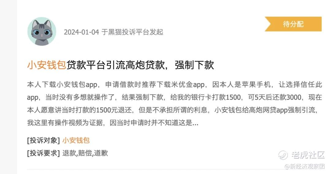 不止是貸款中介,“小安錢包”可能將用戶進一步導流給貸款超市。在今年1月份,有投訴人在黑貓投訴稱,下載小安錢包app,申請借款時推薦下載米優金app,結果強制下款,給銀行卡打款1500,5天后還款3000。該投訴人稱“小安錢包給高炮網貸app強制引流”。