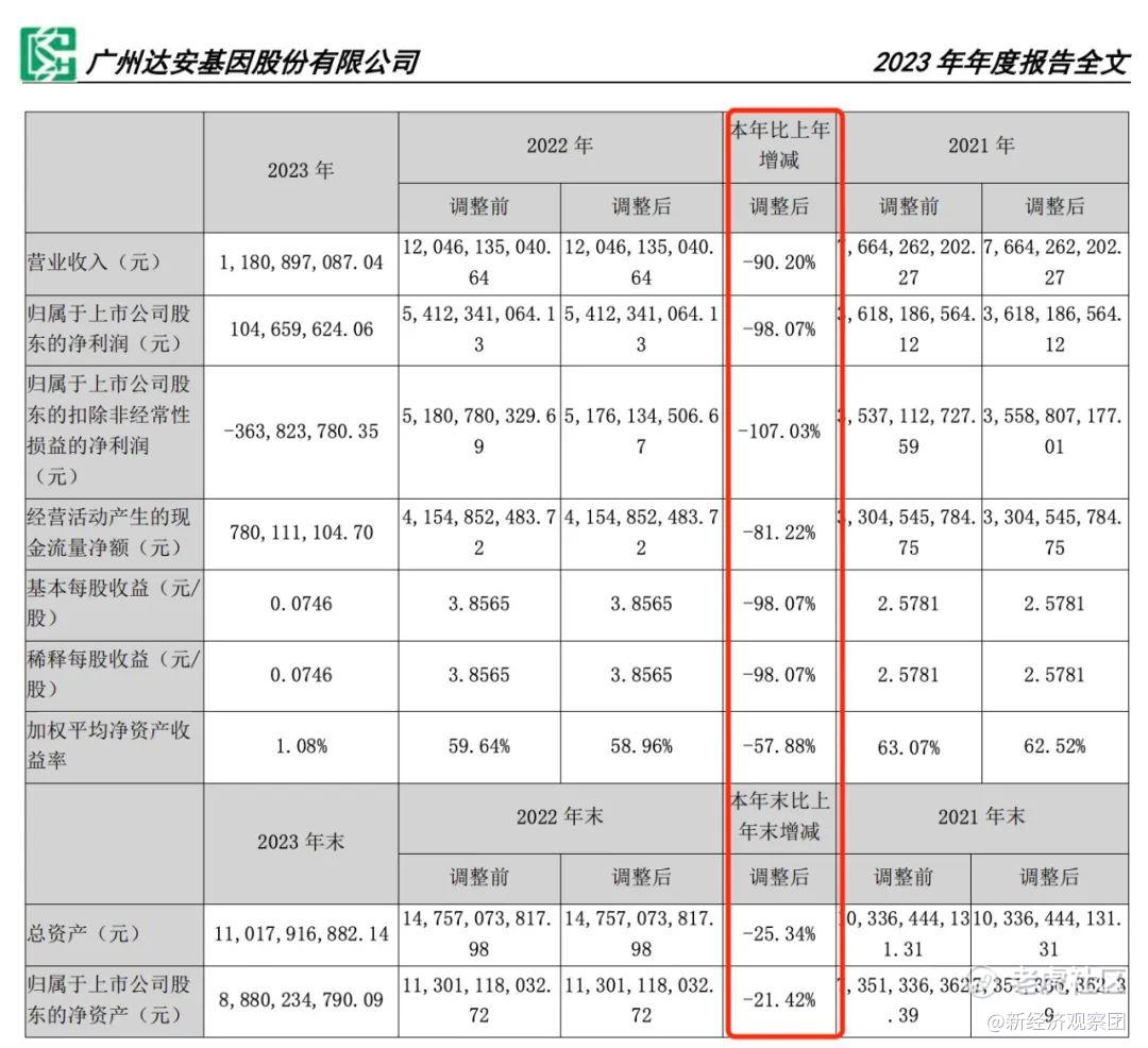 達安基因2023年財報顯示,公司實現營業收入11.81億元,同比下降90.20%,歸母淨利潤爲1.05億元,同比下降98.07%;實現經營活動產生的現金流量淨額7.8億元,同比下降81.22%。