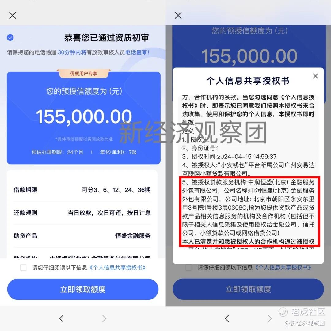 當然,安易達小貸也做了“亡羊補牢”的類似措施,領取額度需要再同意一份《個人信息共享授權書》。該授權書顯示,被授權人爲安易達小貸。被授權貸款服務機構爲中潤恆盛,地址爲北京市朝陽區永安東里XXXX。