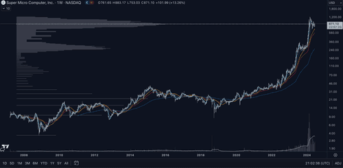 $SUPER MICRO COMPUTER INC(SMCI)$ Weekly. Nice day trade here. If you're long, take a good look at this. That volume profile is textbook distribution. Ever hear 'retail always buys the top'? This is what it looks like. That's Wall Street dumping their positions on the retail investment community. Days are used to draw in liquidity (buyers for them to sell to). Best bet for longs is an upthrust after distribution (UTAD). Unlikely IMO as the Apr 22 low already broke 'the ice'. Watch the diagonal demand line. If it loses that, all hell will break lose.
