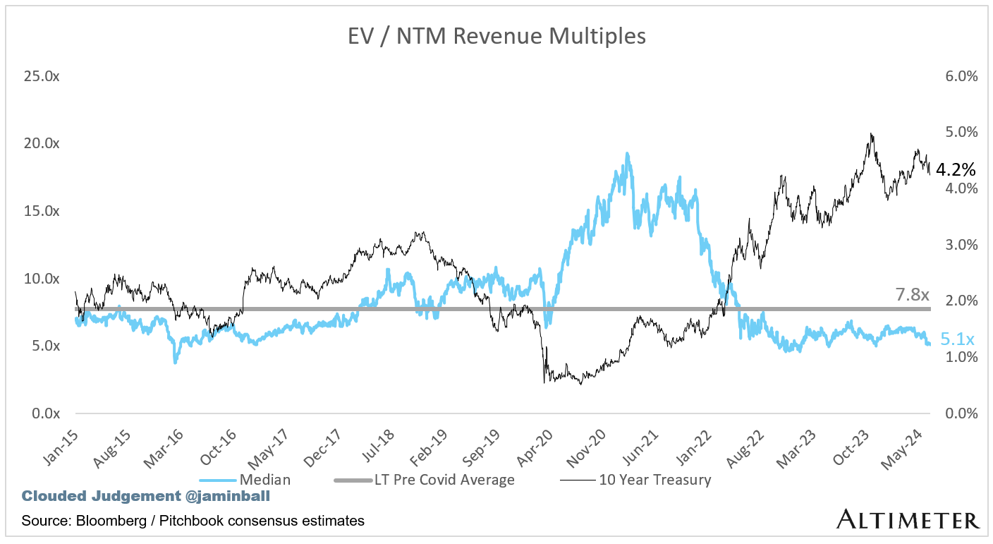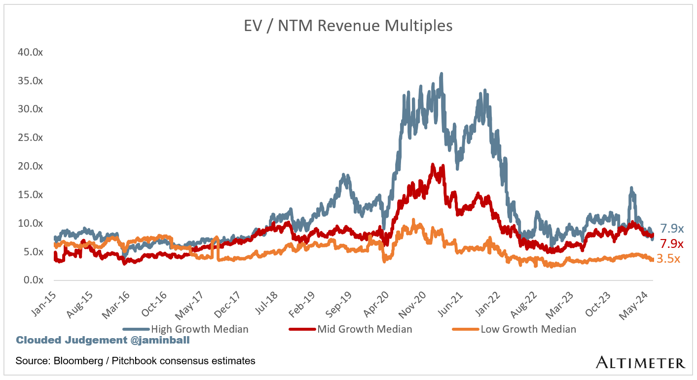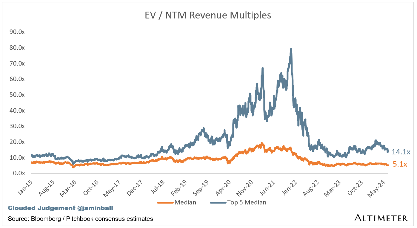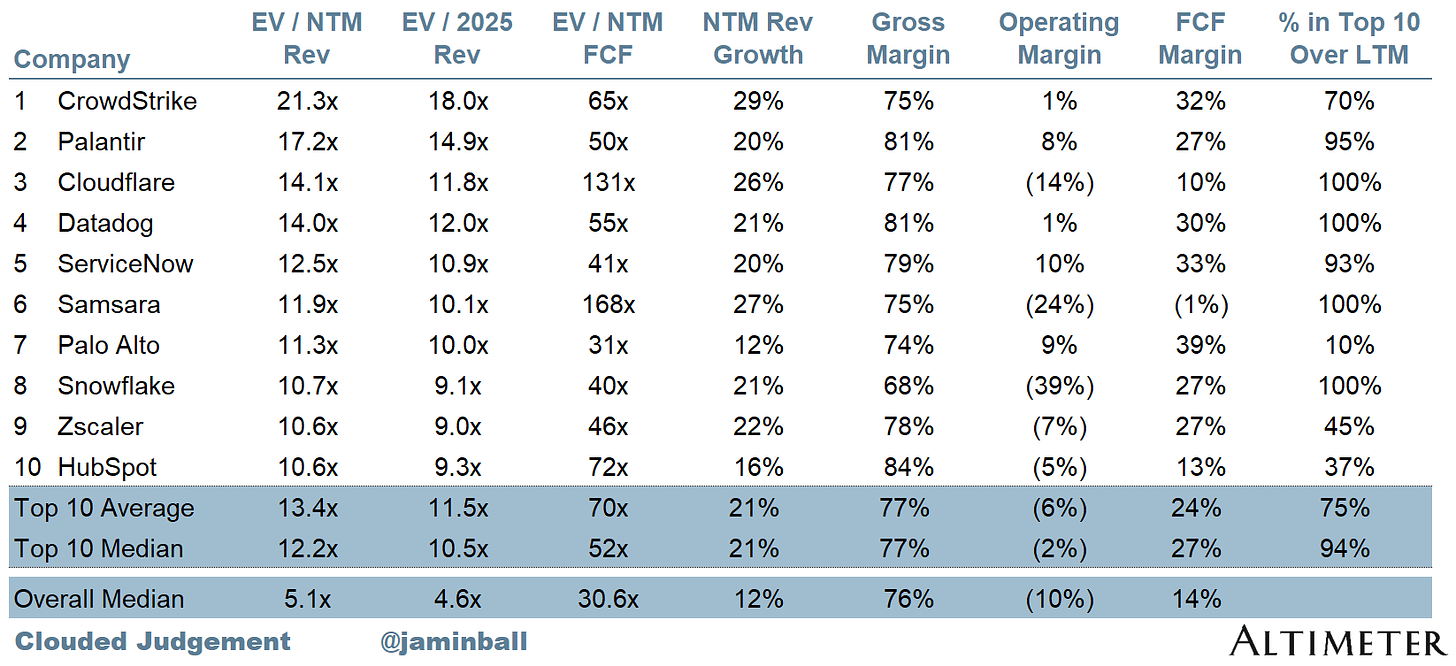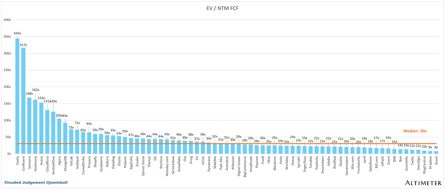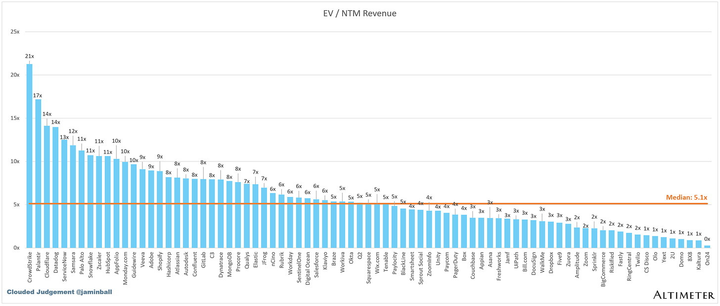 SaaS businesses are generally valued on a multiple of their revenue - in most cases the projected revenue for the next 12 months. Revenue multiples are a shorthand valuation framework. Given most software companies are not profitable, or not generating meaningful FCF, it’s the only metric to compare the entire industry against. Even a DCF is riddled with long term assumptions. The promise of SaaS is that growth in the early years leads to profits in the mature years. Multiples shown below are calculated by taking the Enterprise Value (market cap + debt - cash) / NTM revenue.