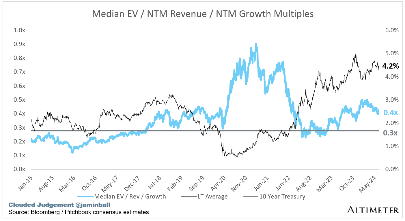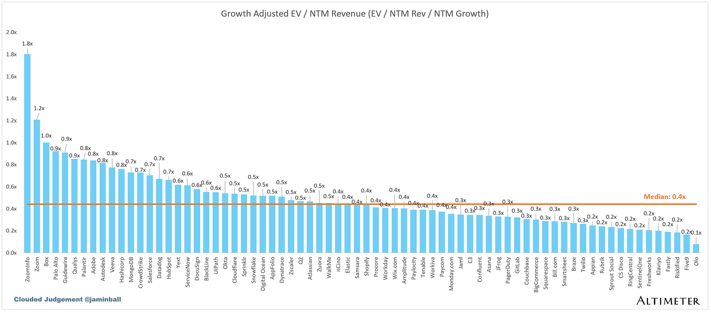 The below chart shows the EV / NTM revenue multiple divided by NTM consensus growth expectations. So a company trading at 20x NTM revenue that is projected to grow 100% would be trading at 0.2x. The goal of this graph is to show how relatively cheap / expensive each stock is relative to their growth expectations