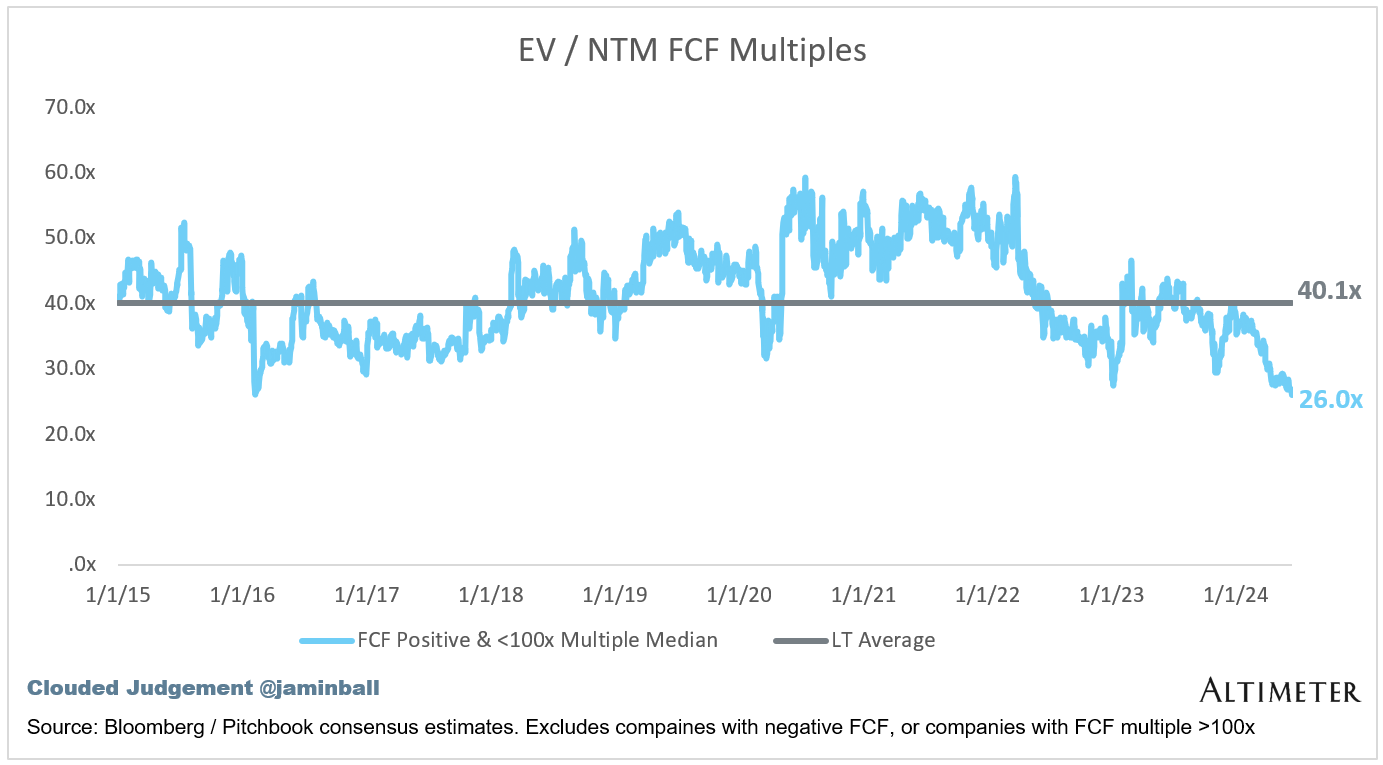 The line chart shows the median of all companies with a FCF multiple >0x and <100x. I created this subset to show companies where FCF is a relevant valuation metric.