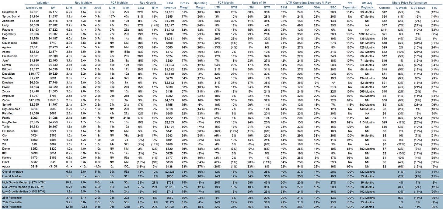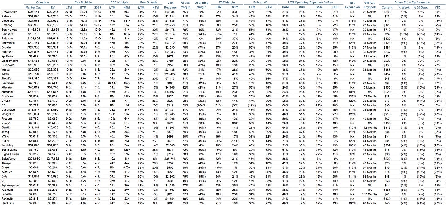 Rule of 40 shows rev growth + FCF margin (both LTM and NTM for growth + margins). FCF calculated as Cash Flow from Operations - Capital Expenditures