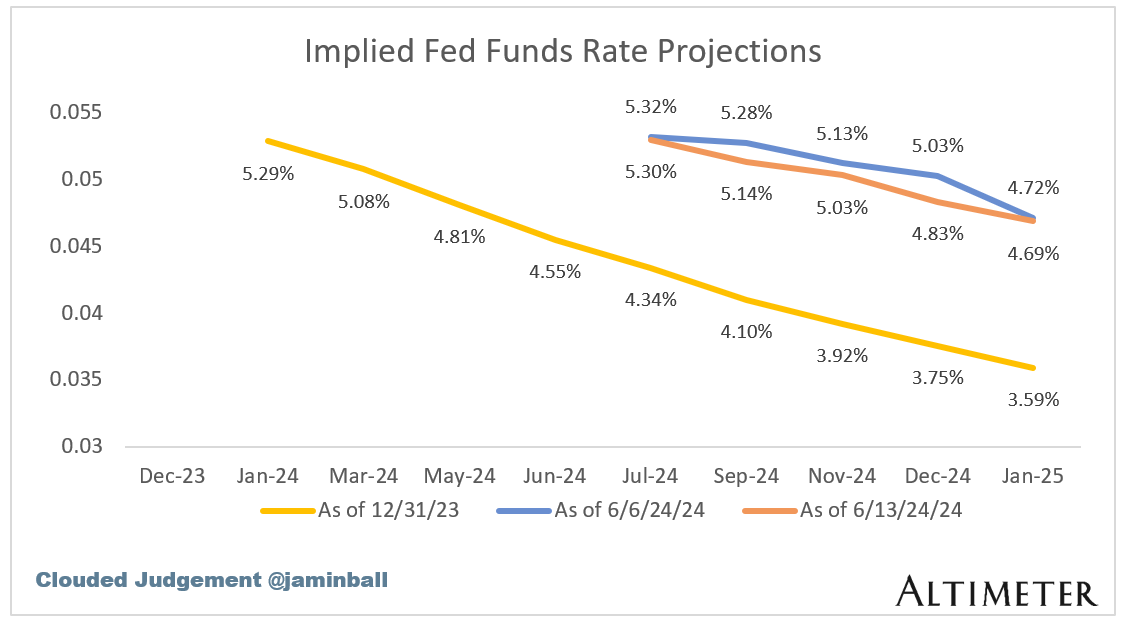 The chart below shows the market’s expected future Fed Funds rate (it’s currently ~5.33%). The yellow line shows the market’s expectation at the beginning of the year. The blue line shows the expectation from a week ago, and the orange line is the current expectation. As you can see, the expectation at the beginning of the year was WAY off. Rates have not come down. When we look at the orange line (after May inflation report) vs blue line (pre May inflation report), you’ll see that the May inflation data prompted the market to expect one additional rate cut (expecting 2 rate cutes by year end vs 1 prior to the May inflation data).