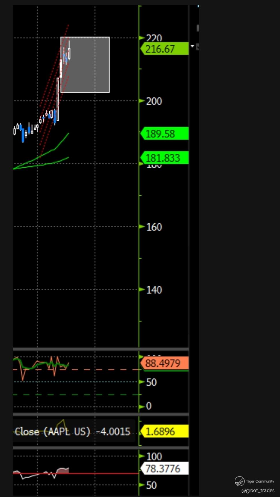 APPL looks bullish with Trend up, ROC is above 1, RSI at 78 but stochastics seems to be merging.