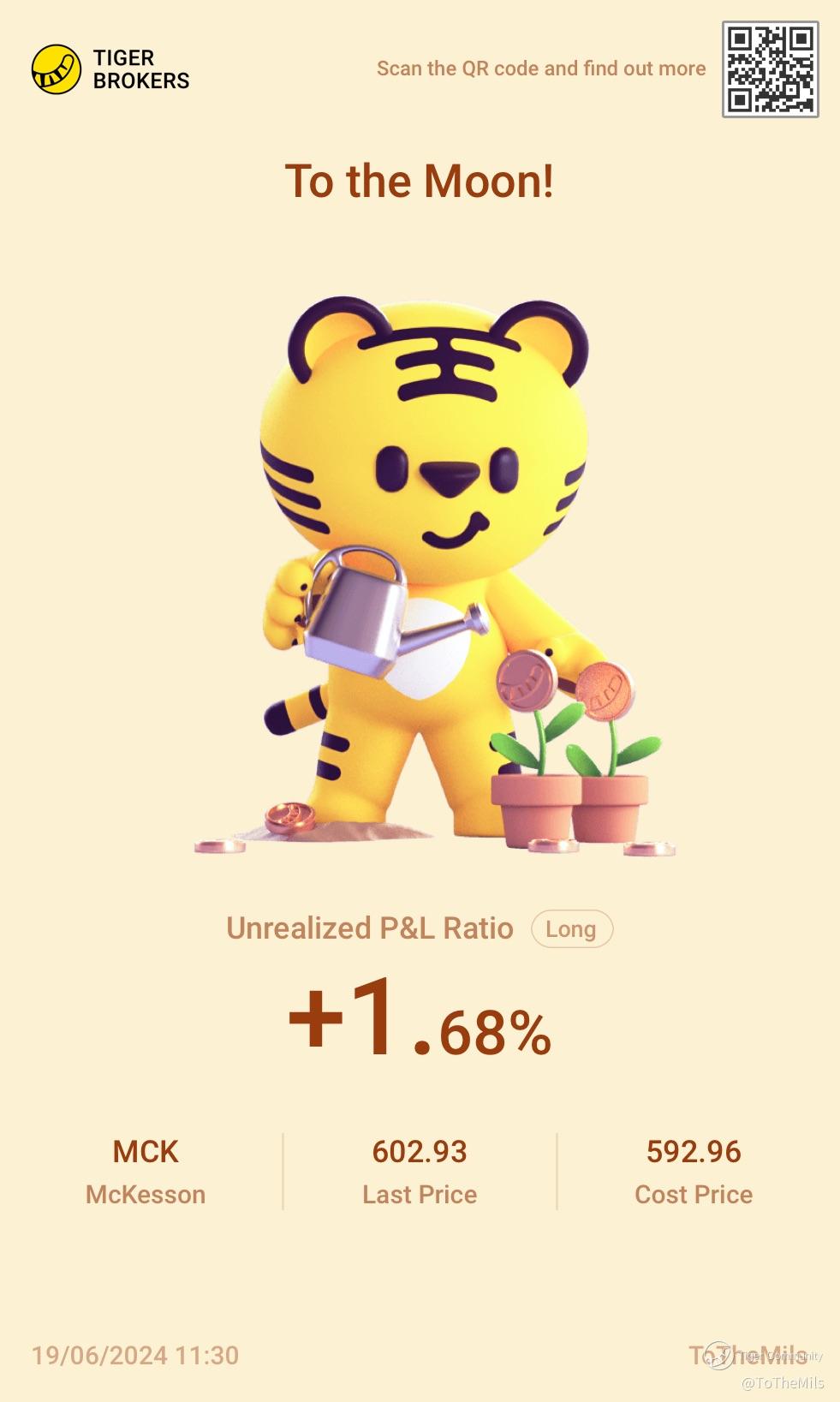 $McKesson(MCK)$ bullish slowly but surely.. View: long term hold. online research shows consensus rating of strong buy, technical side of thing looking superb with uptrend since may 23.