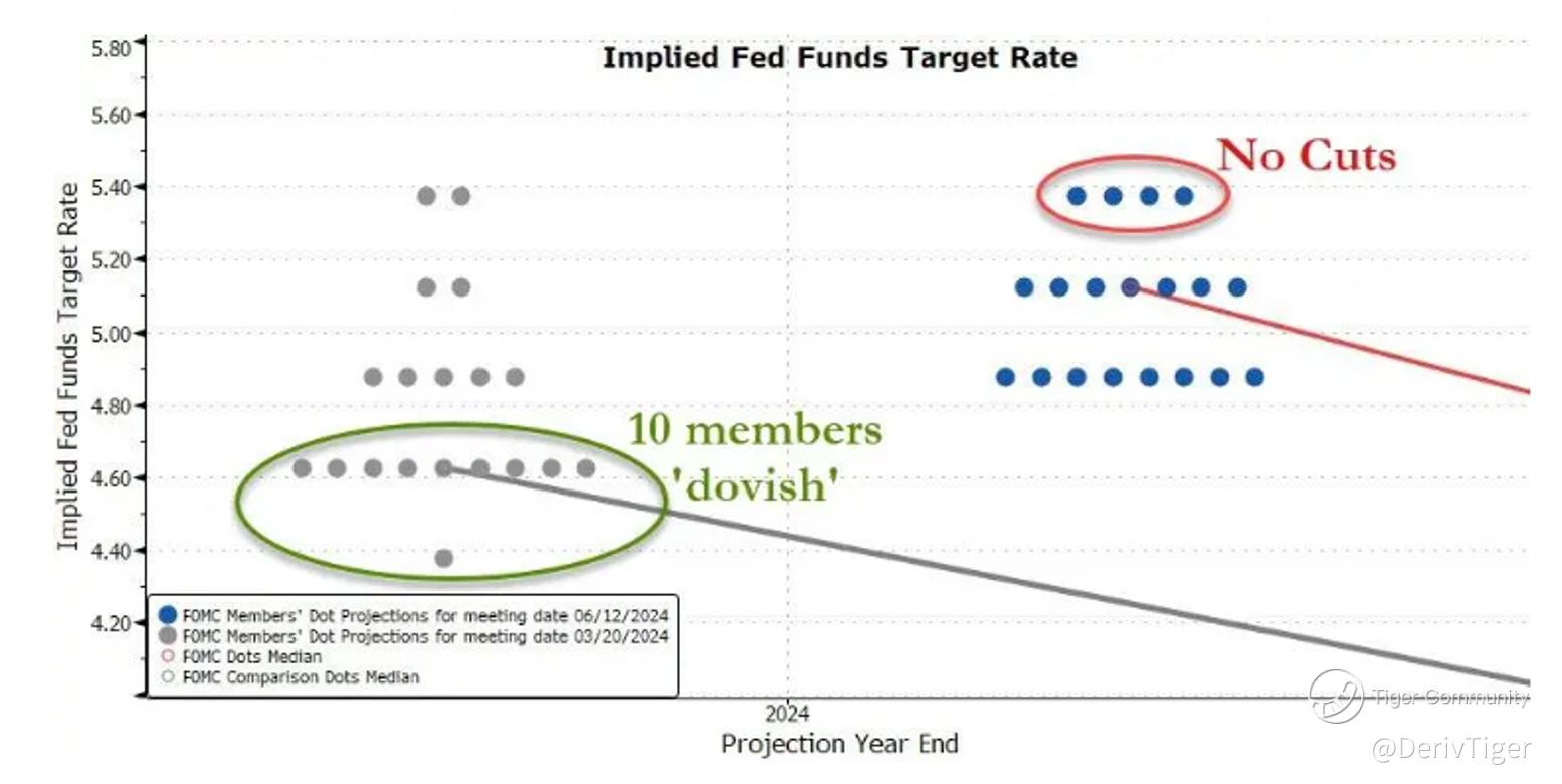On the same day, the Federal Reserve's FOMC decided to maintain the current interest rates. The meeting statement was largely consistent with previous ones, but the dot plot was much more hawkish than before. Currently, no officials believe there will be three or more rate cuts this year, and the numbers for one and two rate cuts are almost evenly split. Powell continued to maintain a "data-dependent" stance, stating, "The U.S. economy is very strong, and it's good to see inflation improving, but one month of good data is not enough; we need more to support this...".