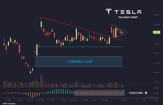 $Tesla Motors(TSLA)$ Inside day, tight pennant, multi-week TTM squeeze...