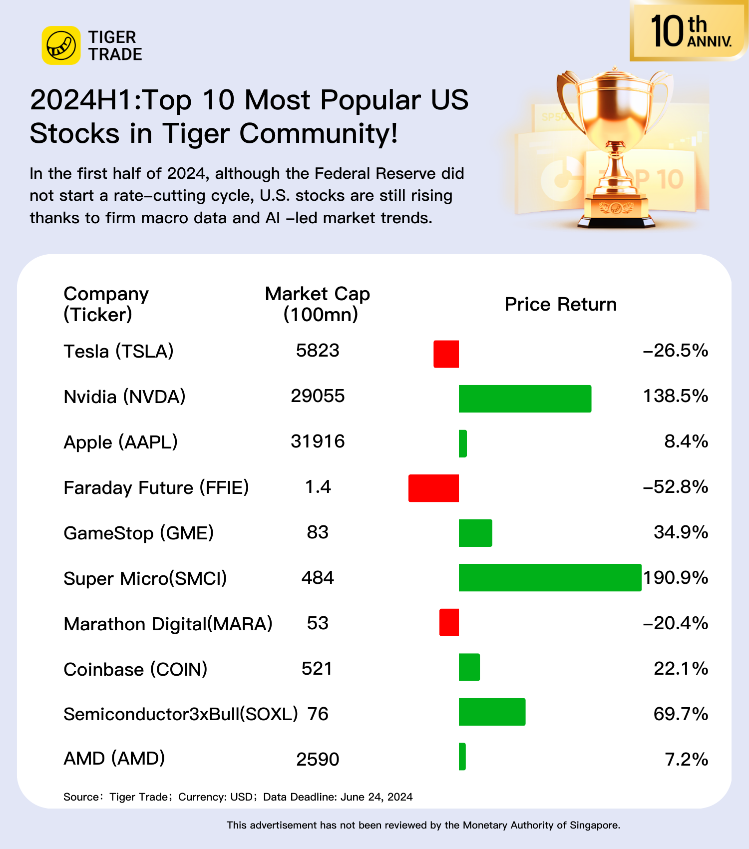 Here are the 10 most popular U.S. stocks in the Tiger community for the first half of 2024:
