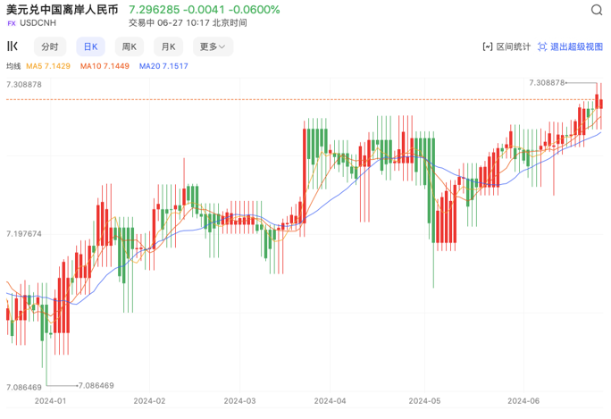 A few days ago, the dollar continued its strong performance against the renminbi in previous months. On June 26, as the the US Dollar Index soared, the exchange rate of the offshore RMB against the US dollar fell below 7.30 intraday, and the lowest point hit 7.308878. This is the first time since November 15, 2023 that it has broken through the above-mentioned mark.
