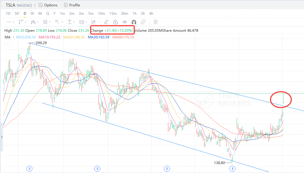 Last night, Tesla surged 10% intraday, marking its second-best single-day gain of the year. From a technical perspective, Tesla's daily K-line broke out of the downward trend channel that started in July 2023, turning bullish.