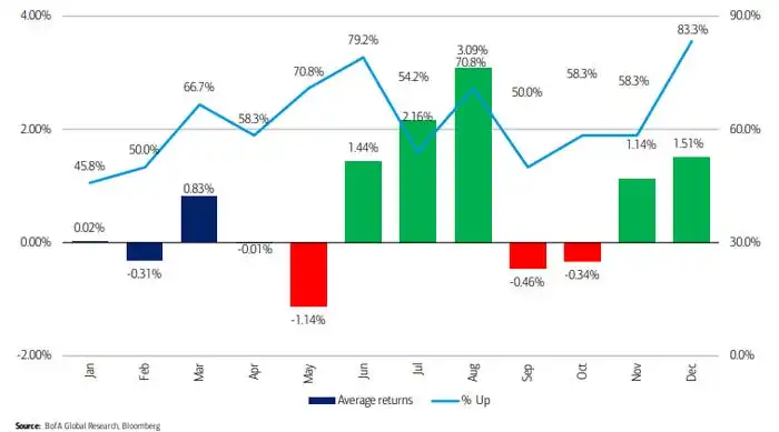 The chart below shows that US stocks typically exhibit volatility from January to May, a summer rebound from June to August, heightened volatility and declines before the election in September and October, and a post-election rebound in November and December.