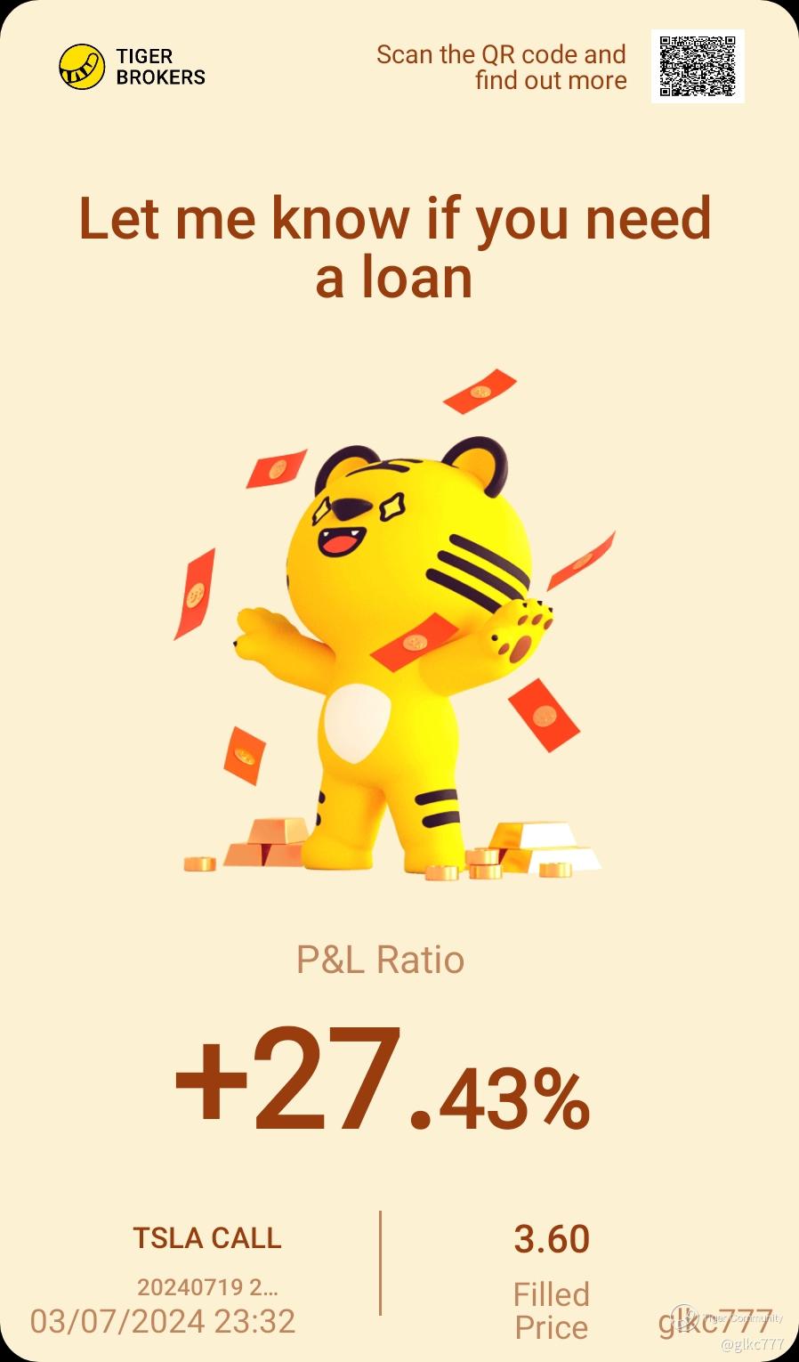 $TSLA 20240719 270.0 CALL$ closed a quick scalping for short call due to the over optimism from market after Tesla latest deliveries result exceeded expectations. More that 5 years ago Tesla have limited EV competitors. Today she has a horde of incumbents and startups chasing down her neck and winning market share. Tesla currently does not have monopoly on autonomous driving with Waymo and the likes having higher FSD capabilities. Nevertheless will continue to ride the wave for entry trade opportunities.