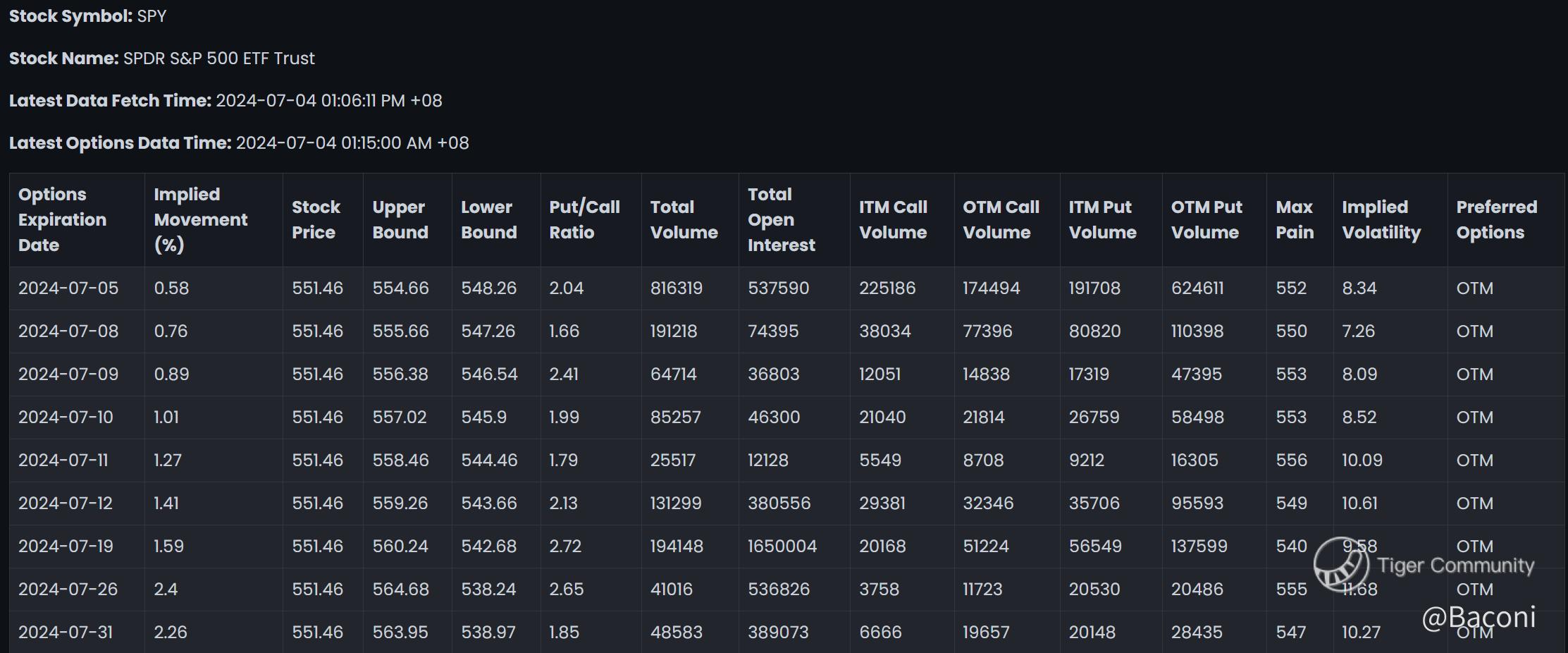 As of July 4, 2024, SPY is trading at $551.46. Analysts observe the upper bound of $554.66 and the lower bound of $548.26, derived from the implied movement data. The ETF's put/call ratio stands at 2.04, reflecting a significant leaning towards put options, often suggesting a bearish sentiment among investors.