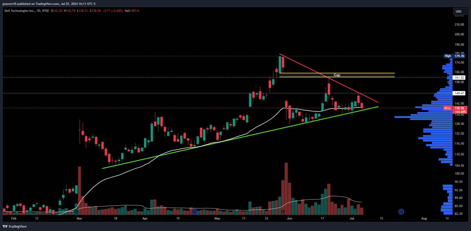 $Dell Technologies Inc.(DELL)$ When dell shows some bullish move on a shorter time frame, I like the set up here on the daily for a bounce to the top of this pennant. Above $150 and this can really move! It will fill that gap soon.