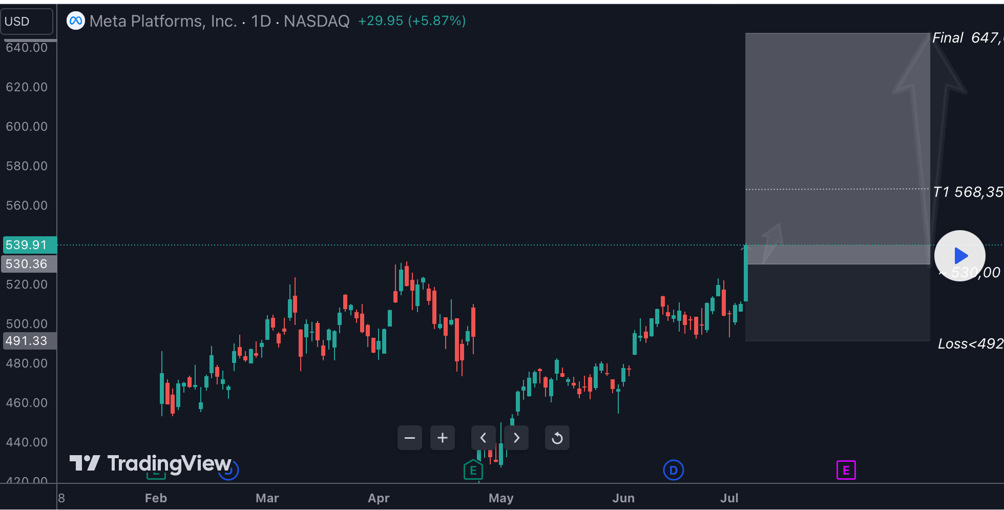$Meta Platforms, Inc.(META)$ META has the support of Fiboclouds for appreciation within the H4, Daily, and Weekly timeframes, being sufficient to reach the first target and attempt the second, provided the stop loss is properly repositioned at the time of the first partial realization.