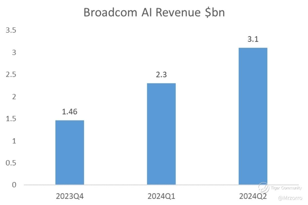 The standout in the earnings report was Broadcom's AI business. Its AI revenue for Q2 reached 3.1 billion, and the company expects a staggering 100 billion generated in this business in 2024, accounting for 20% of total revenue.