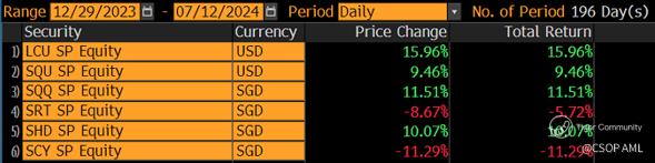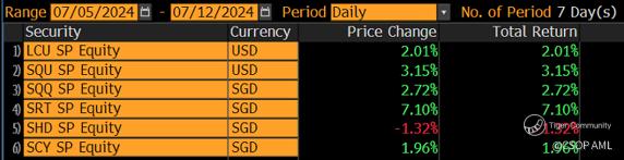 •Last week, LCU (+2.01% in USD), SQU (+3.15% in USD), SRT (+7.10% in SGD) and $CSOP Star&Chinext50 S$(SCY.SI)$ (+1.96% in SGD) gained, while $CSOP DIV ETF S$(SHD.SI)$ (-1.32% in SGD) fell.