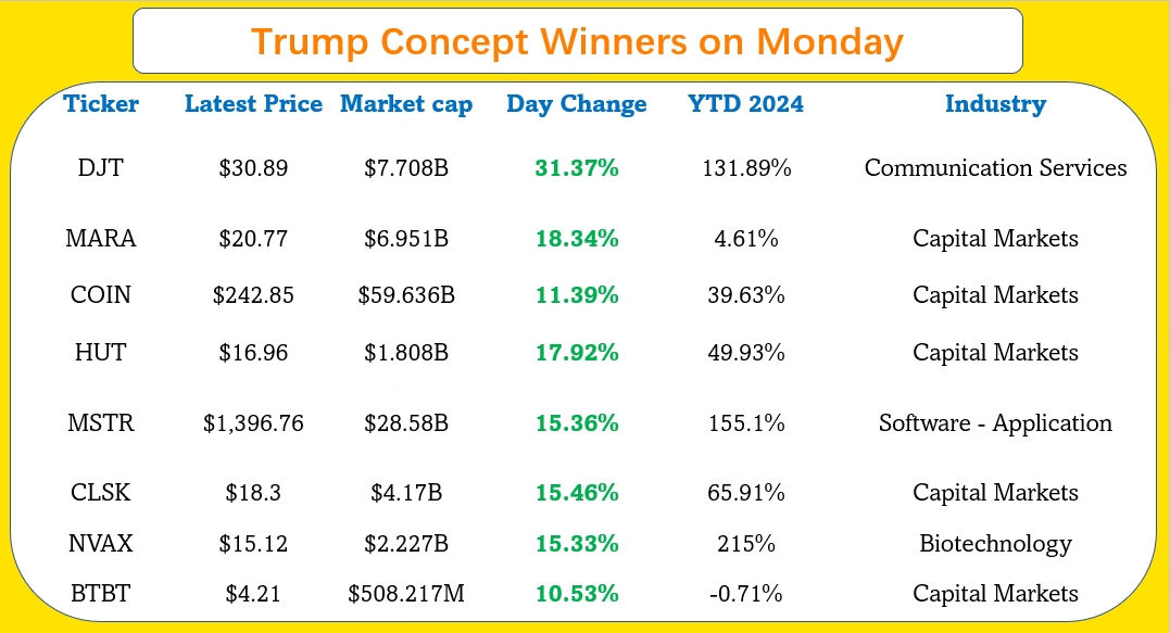 In the Monday trading, Trump concept stocks performed exceptionally well, with stocks like $Trump Media & Technology(DJT)$ , $Marathon Digital Holdings Inc(MARA)$ , $Coinbase Global, Inc.(COIN)$ , $Hut 8 Mining Corp(HUT)$ , $MicroStrategy(MSTR)$, $CleanSpark, Inc.(CLSK)$, $Novavax(NVAX)$, $Bit Digital, Inc.(BTBT)$ , and etc., gapping up and surging more than 10%.