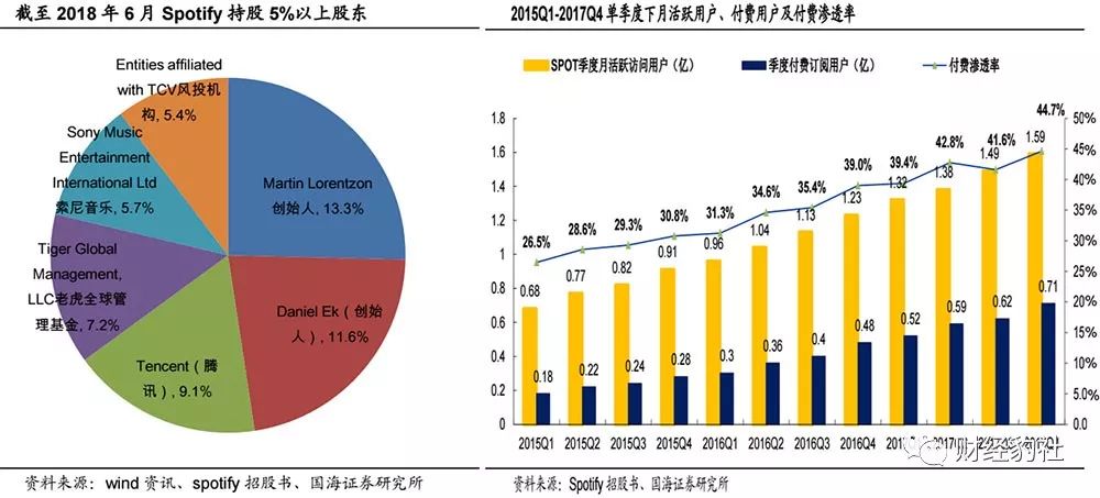 Spotify於2018年4月美國紐交所上市,即不發行新股募集資金,不參與投行企業和設定發行價,3月 14日將1.836 億普通股1拆40股,並以價降低至紐交所新上市公司的平均發行水平。其中Martin Lorentzon(創始人)、Daniel Ek(創始人)、騰訊、老虎基金、索尼音樂以及一家著名風投機構持股佔比分別爲13.26%、11.59%、9.07%、7.19%、5.7%、5.4%。