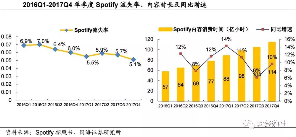 2016年Spotify推出“家庭計劃”與“學生計劃”使ARPU從2016Q4的6歐元降至2017Q4的5.24歐元,但助力公司流失率的降低。聽衆流失率從2016Q1的6.9%下滑至2017Q4的5.1%,凸顯Spotify的音頻內容體驗對用戶的粘性增強,推出的優惠計劃有利於降低流失率。2016Q1-2017Q4內容消費時間從67億小時增至114億小時。據招股書顯示,2017Q4Spotify 每個月活躍用戶每月平均聽25個小時。