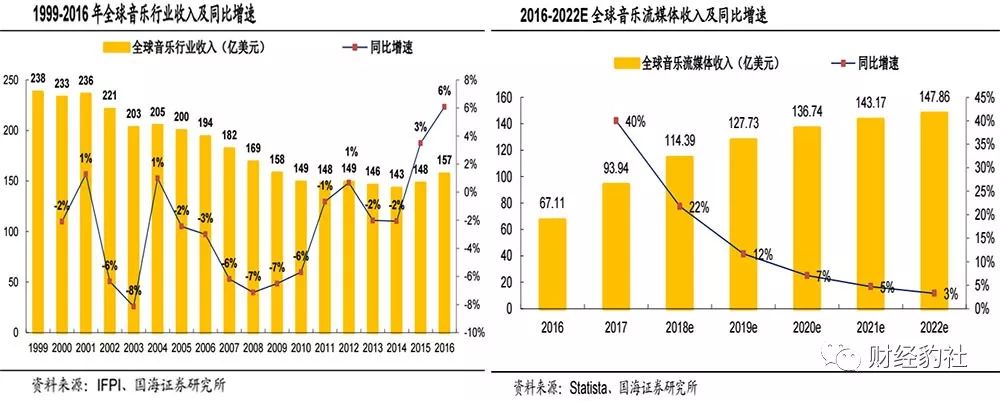 移動互聯網的發展讓用戶獲取內容從被動變主動,無論是視頻還音樂也都如此,據 IFPI(國際唱片協會)數據顯示全球音樂行業收入從 1999-2014年下滑40%,2015 年流媒體音樂助力全球音樂行業發展,收入恢復增長至3%。2016年全球付費用戶超1億,音樂行業總收入爲157億美元,同比增長6%,成爲近20年快速增長的一年,其中數字音樂收入爲78億美元,同比增長18%,數字音樂市場收入超過實體音樂收入。流媒體音樂收入爲46億美元,同比增長60%,流媒體成爲音樂行業增速主要推動力。