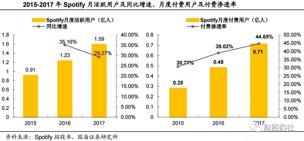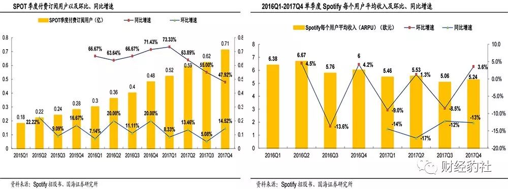 相關數據顯示,Spotify位列全球正版音樂流媒體訂閱服務商首位,2017Q4月活用戶、付費用戶分別達1.59億、0.71億,同比增長分別約29.27%、47.92%,2017Q4較2017Q3增長了14.52%。