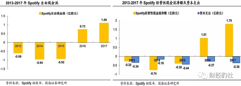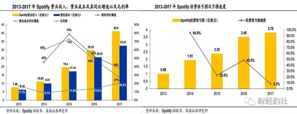 2017年母公司淨利潤虧損12.35億歐元,其中財務費用、經營性(主要包括版權費、出版商費)虧損分別爲8.57億、3.78 億歐元,經營性虧損速度收窄至 8.3%。截至2017年底Spotify融資成本增加6.38億歐元。