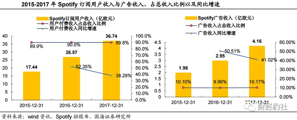 訂閱用戶付費收入是Spotify主要收入,2015-2017年訂閱用戶收入分別爲 17.44、26.57、36.74 億歐元,佔公司總收入比例分別爲 89.9%、90%、89.8%,廣告收入佔總收入比例分別爲10.1%、9.99%、10.17%。