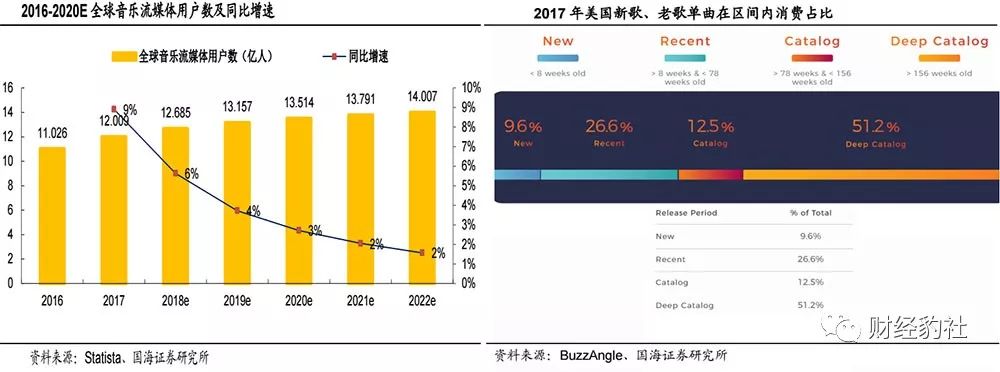 據BuzzAngle 據顯示,流媒體音樂平臺上歌曲發行時間在8周之內、8-78周、78-156周、超156周的單曲消費佔比分別爲 9.6%、26.6%、12.5%、51.2%。可見新歌是時下流行代表,但老歌仍具有較強長尾效應。因此,國海證券認爲,擴充新版權疊加老歌版權權利有利於放大長尾值。
