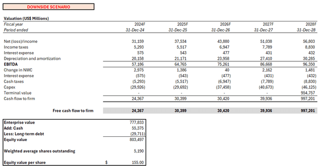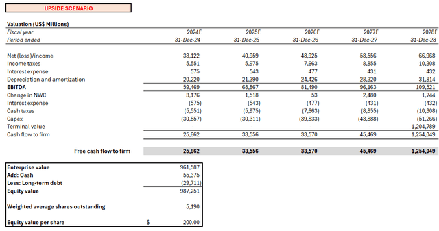 We believe TSM continues to demonstrate momentum for a further upsurge towards the upside scenario price of $200 apiece in the near-term, which considers cash flows in line with the upper range of management’s raised guidance. Specifically, in the upside scenario, we value cash flows stemming from revenue estimated at a 12% 10-year CAGR, which includes consideration for management’s anticipation for a 50% CAGR in AI processor demand over the longer-term. The robust outlook for processors based on TSM’s advanced process nodes and packaging capabilities is a key margin accretive factor, underpinning cash flow growth critical to the stock’s valuation prospects. The upside scenario price considers the same key valuation assumptions as the base case analysis (i.e., 10.4% WACC; 1.5% long-term perpetual growth rate).