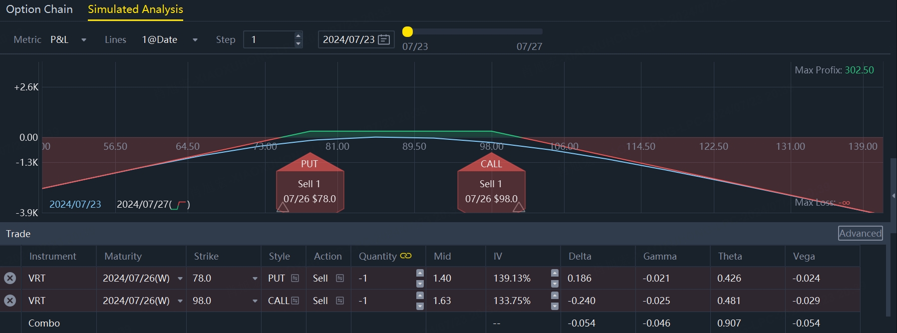 In this trade, the total premium received is $300. However, it comes with obligations: first, from the put option, where the buyer can sell VRT to the investor at $78 at any time. Second, from the call option, where the investor must satisfy the buyer's demand to deliver VRT at $98 at any time.