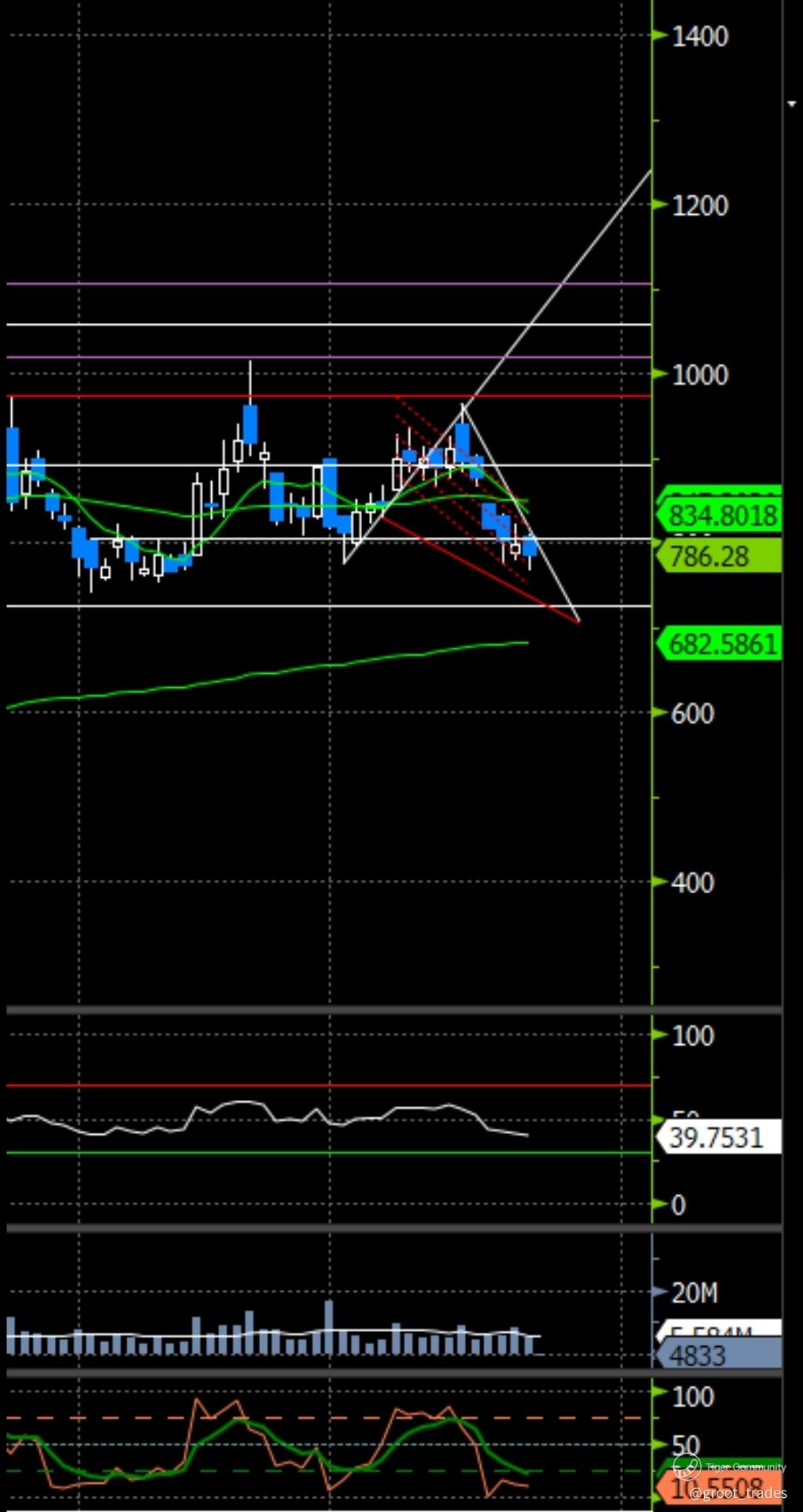 If the current support does not hold, the last support will be around 670. Once that is breached, god help us. Back to to 340 it goes.