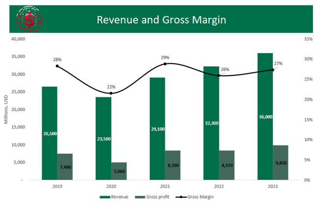 Gross profit followed an upward trend, from $7.49B in 2019 to $9.85B in 2023. Gross margin fluctuated slightly, decreasing from 28% in 2019 to 22% in 2020, stabilizing around 26-29% in the following years.